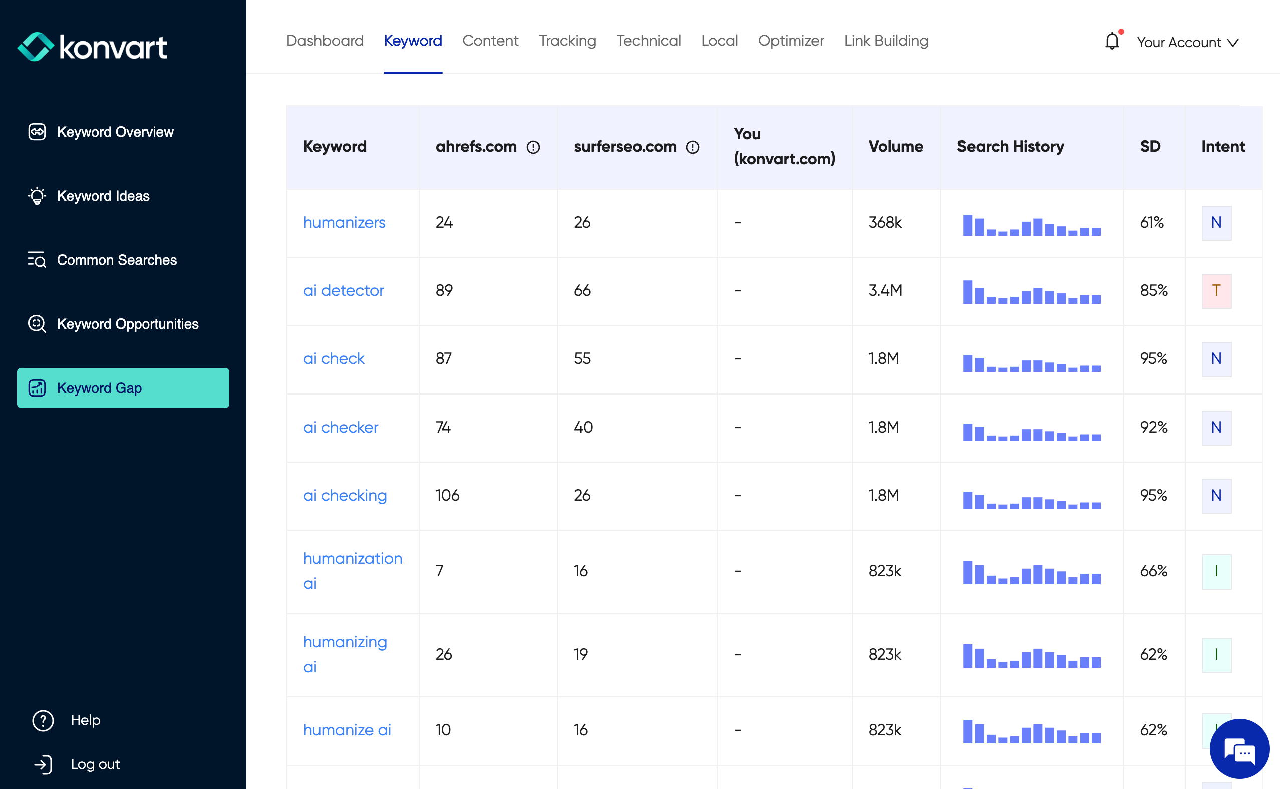 The Konvart keyword gap tool provides insights into keywords that you don't rank for, but competitors do.