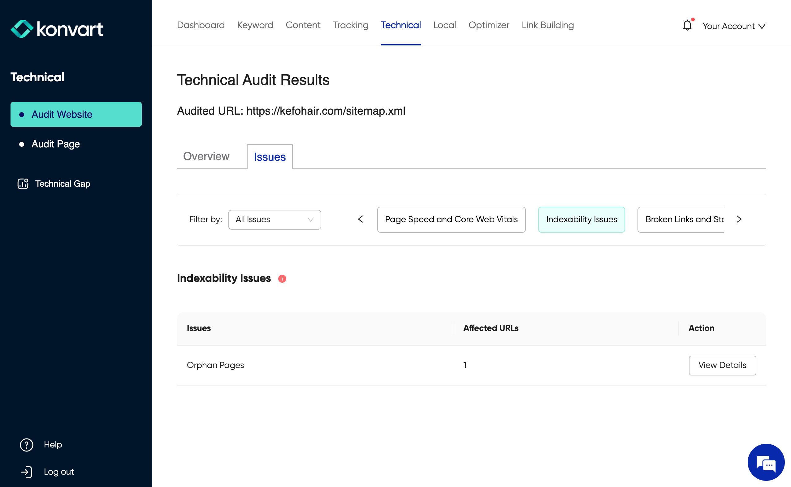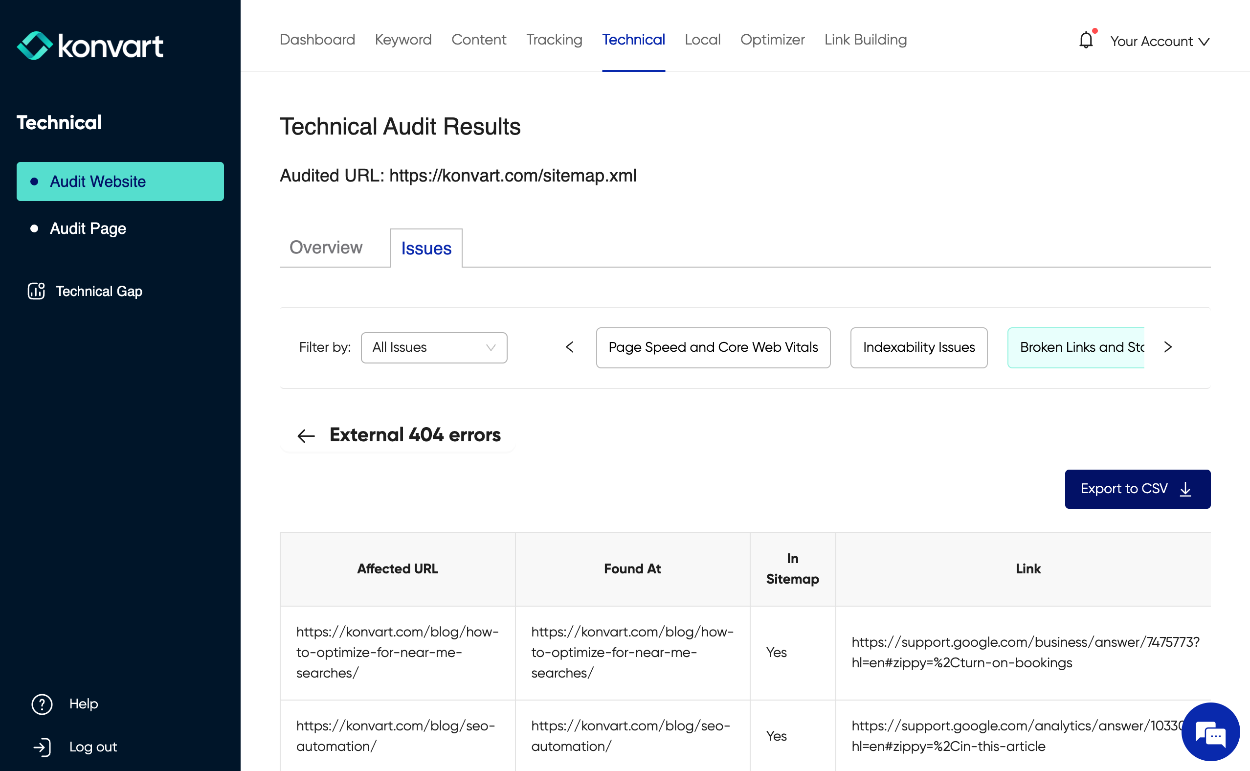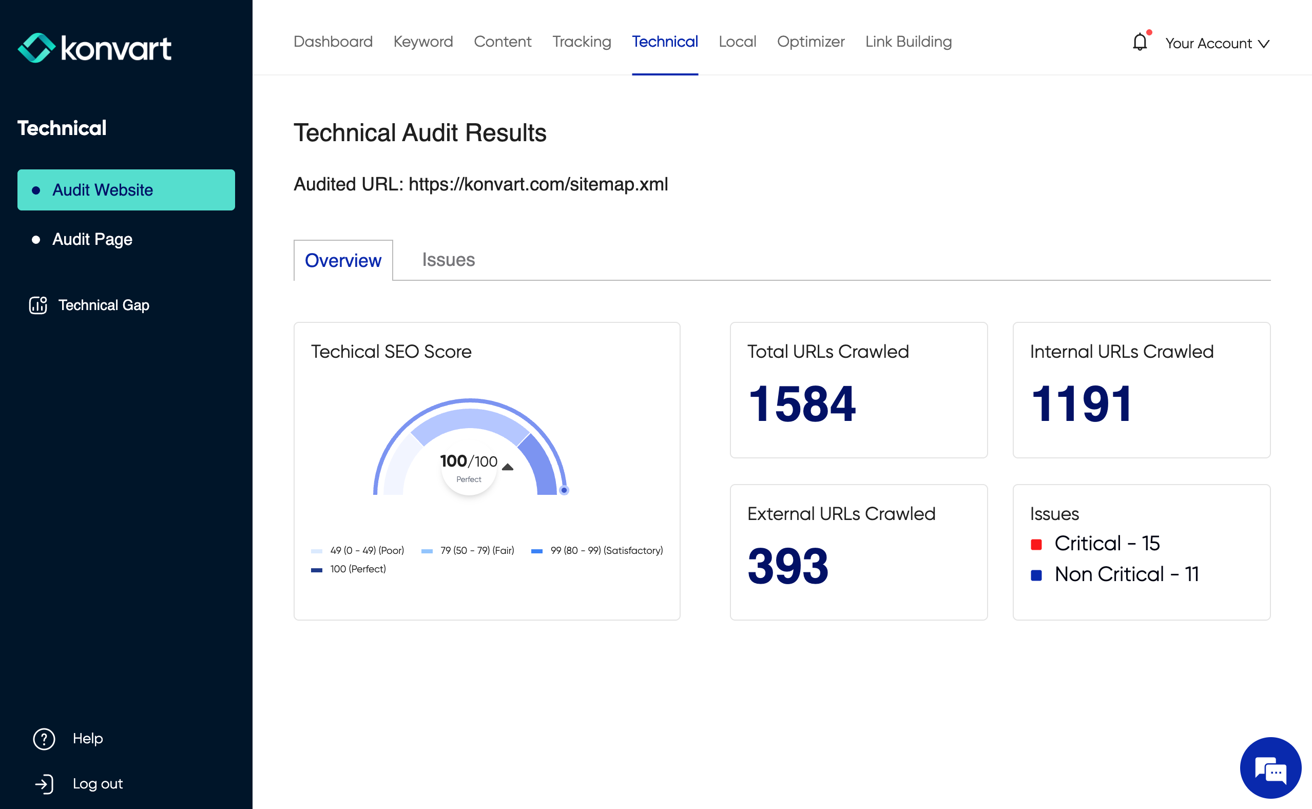 The Konvart site audit tool lets you get a full audit of all the URLs on your sitemap (XML). This is an automated audit that is repeated every seven days.