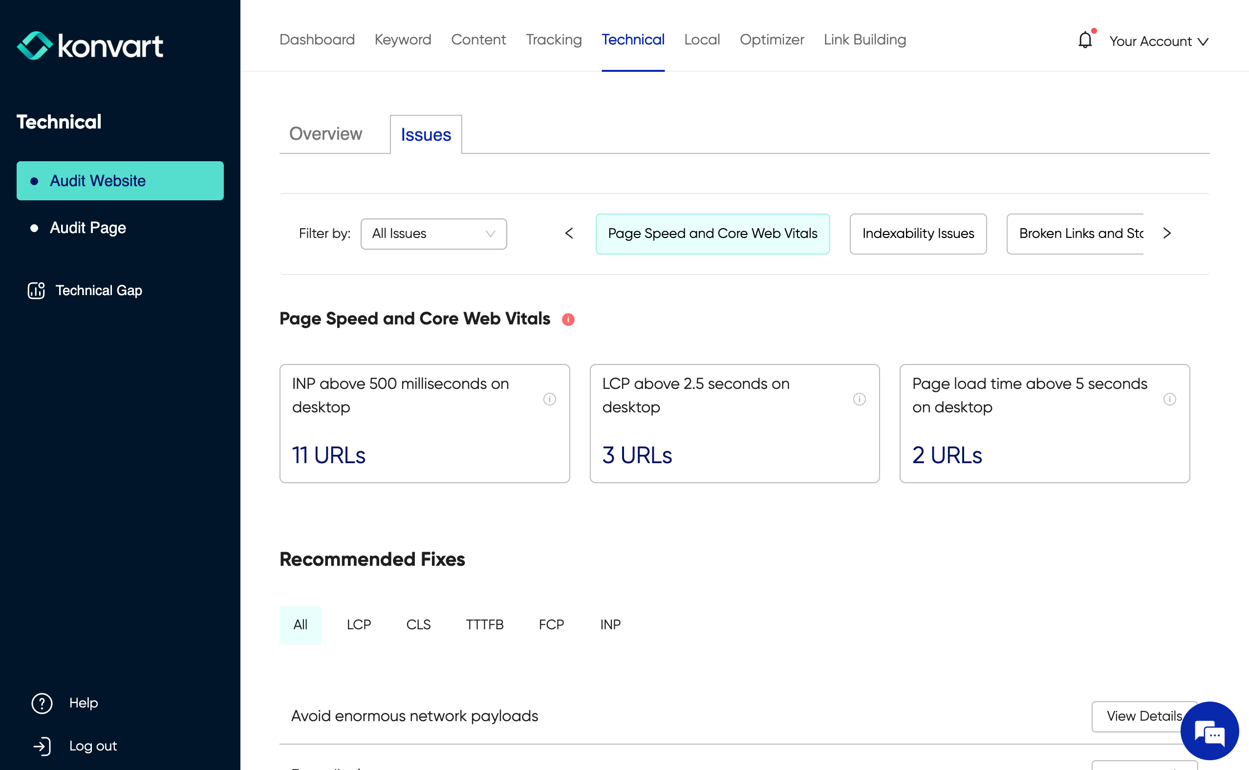 The Konvart technical gap tool reveals technical SEO gaps between you and competitors, including opportunities for schema, core web vitals, page speed, hreflang, and status code. Video Guide <br> Text Guide Step 1: Search Navigate to ...